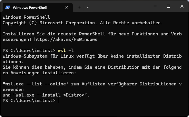 Dieser Ordner ist leer, solange Sie noch kein Linux installiert haben. Starten Sie zunächst die App Terminal. Sie erhalten in Terminal standartmässig die Powershell. Geben Sie hier