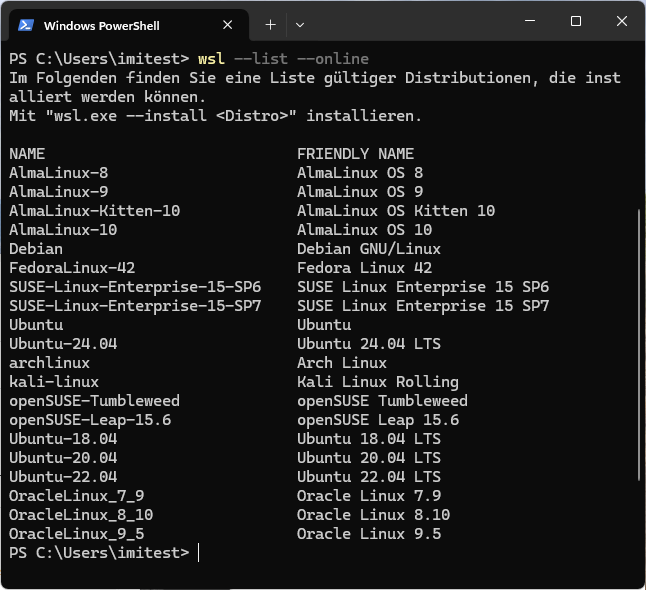 Sie sehen nun alle installierbaren Linux Versionen. Der Standard ist Ubuntu, was eine Abkürzung für die jeweils aktuellste LTS Version ist, hier also Ubuntu 24.04 LTS. Wenn Sie nur den Befehl