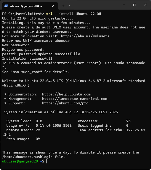 Ubuntu 22.04 wird nun zunächst heruntergeladen und dann installiert. Sie werden dabei aufgefordert einen Benutzernamen ihrer Wahl anzugeben (im Beispiel wurde ubuuser verwendet) sowie ein Passwort für den Benutzer anzugeben. Anschliessend werden Sie als dieser Benutzer angemeldet. Sie sollten dann das System mit den Befehlen
