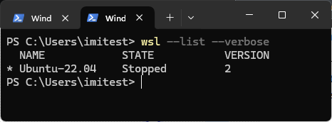 Hier wird Ihnen der Status (Running) ihrer Linux Installation angezeigt. (Die Versionsnummer bezieht sich auf die Version von WSL, hier WSL2. Das ältere WSL1 steht Ihnen nicht zur Verfügung.)